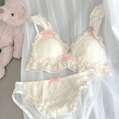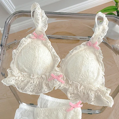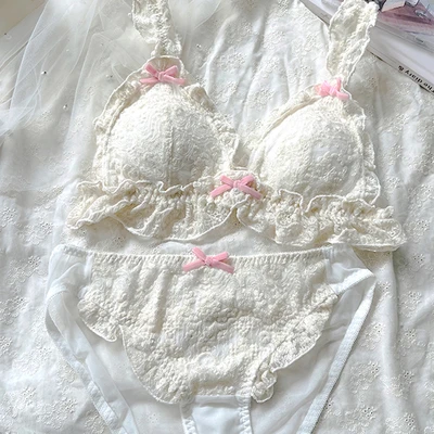 Lovely Japanese soft girl underwear, high appearance value, soft and comfortable, sweet Lolita bra set, sweet lace fabric, exquisite and comfortable, soft and waxy super comfortable, pink butterfly embellishment, super girlish, sweet Beige lace.