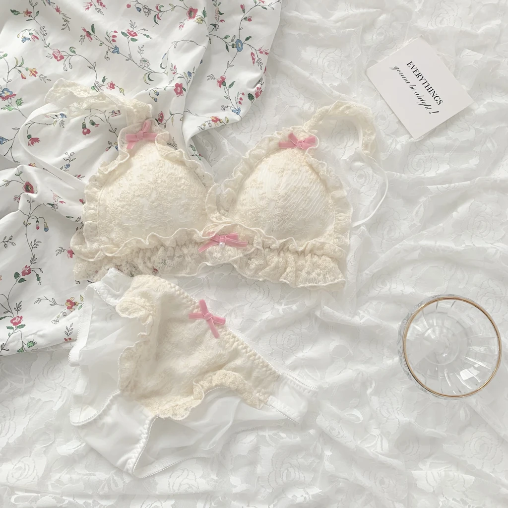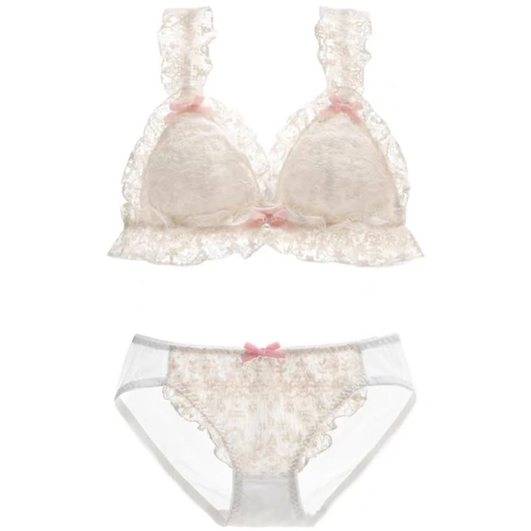 Lolita lingerie set with excessive sweetness! The upper body is so sweet. It's the exclusive style of the little princess. The surface of the cup is very soft and exquisite flower lace, which is very textured. There are small elements of pink velvet bow knot, which is full of girl's heart. This is also the soft cup with the main comfort.