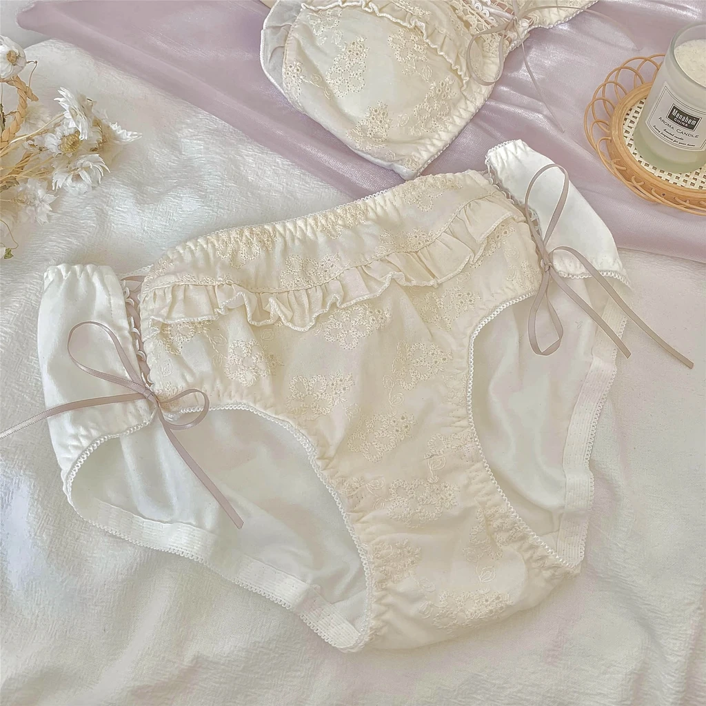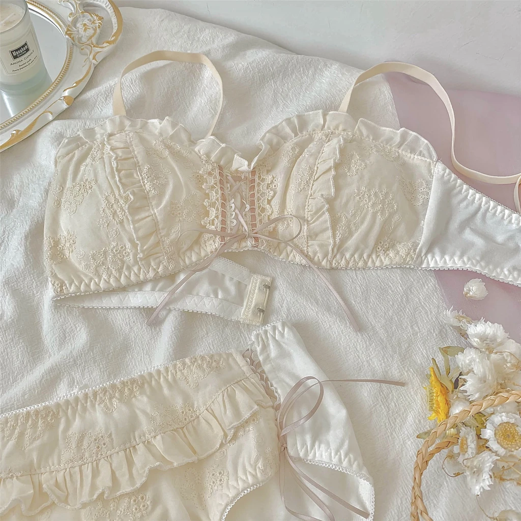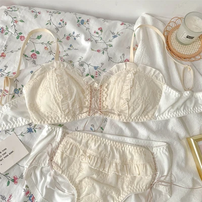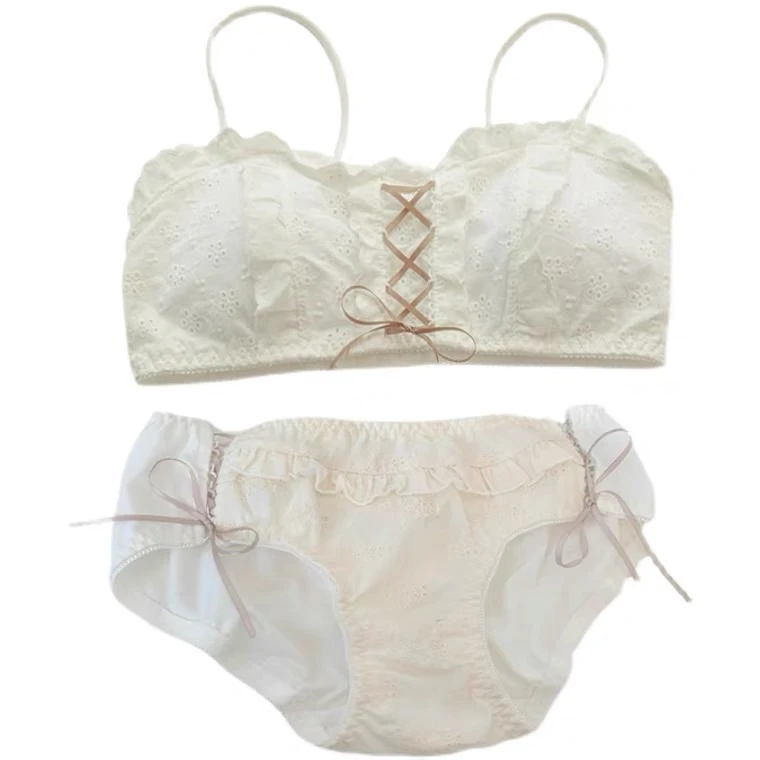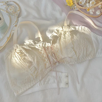 The light milk yellow color matching is the feeling of heartbeat. It is super exquisite and sweet, with delicate hollowed out floret embroidery, lotus leaf edge and cross lace up decoration. It is a retro and romantic pure girl. It has a cotton upper body, light and naked comfort, light and tender love like clouds, thin and beautiful back and shoulder, comfortable and beautiful, invincible and beautiful.
