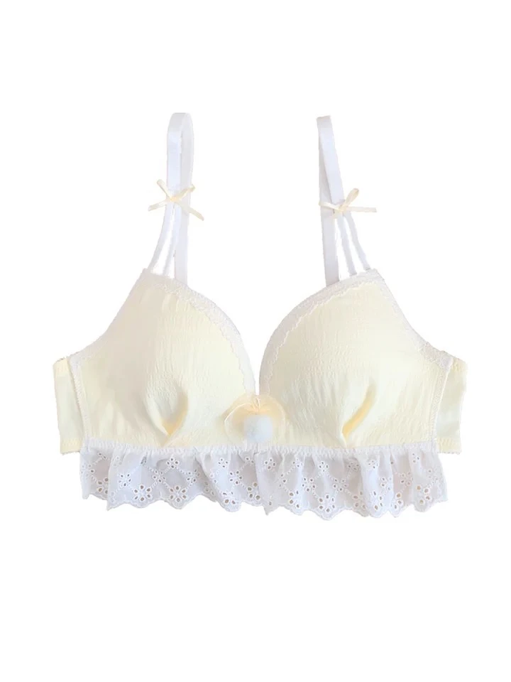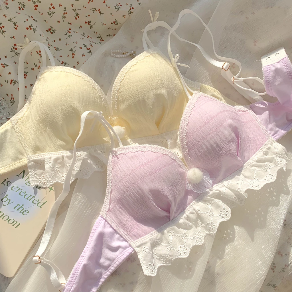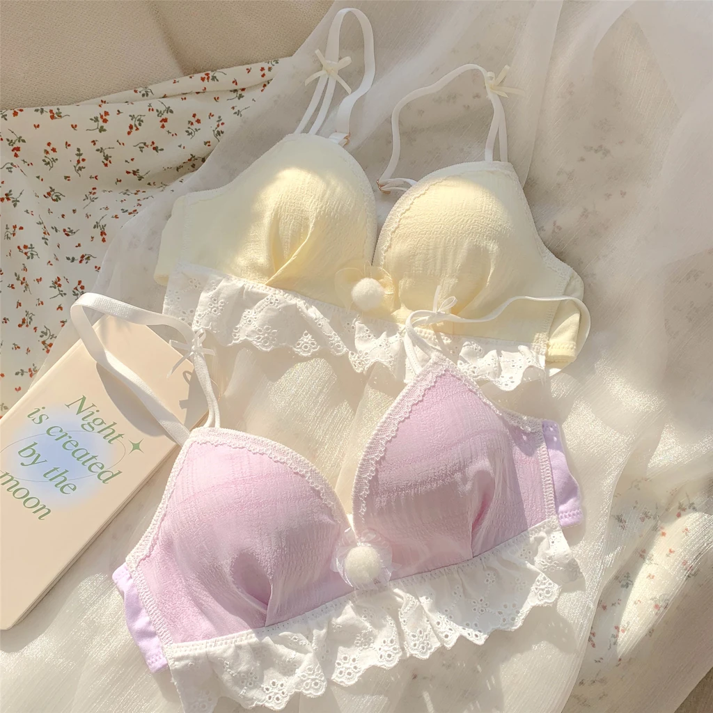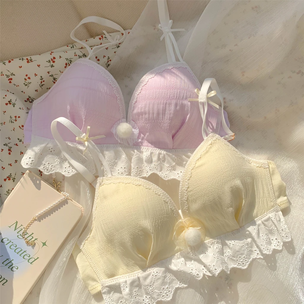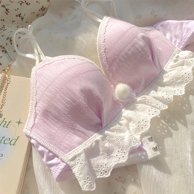The milk sweet small breast bra is slightly wrinkled and comfortable. The low saturation sweet waxy color matching is decorated with shallow and delicate lace. It is clever, pure and exciting. The hairy ball on the chest and the hollowed out design on the hem are very flexible. The underwear has no steel ring.