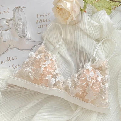 The ear free triangular cup with rich and light nature and the cup surface woven with bare crystal soft yarn are very smart and immortal. It outlines rose like flowers. The delicate baby cotton pad is as lovely as rabbit ears. The underwear has no steel rings.