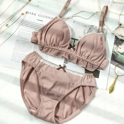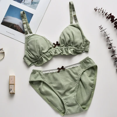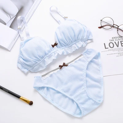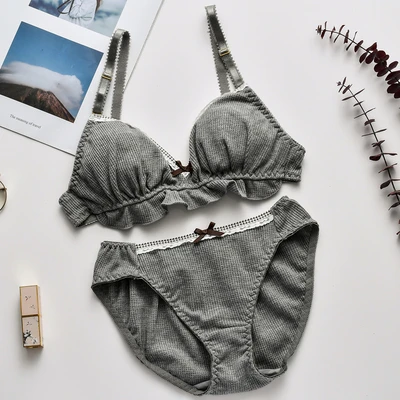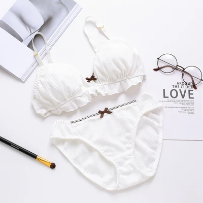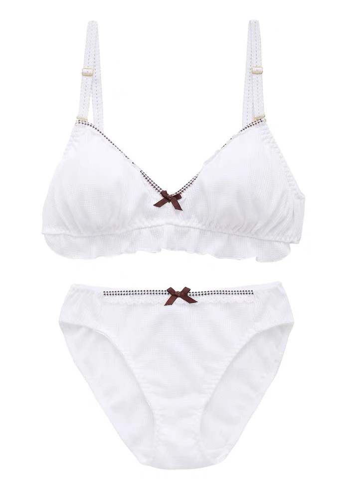 Lovely girl's triangle Cup underwear, the cover is lovely waffle cotton, the inner cup is cotton, no steel ring, no support, built-in insert. The insert is about uniform up and down and can be taken out. Underwear is cotton, low waist, breathable and comfortable, triangular style. The back double breasted underwear with detachable shoulder straps and adjustable size belongs to a comfortable and beautiful style, which can be worn for sleeping or as a bikini.
